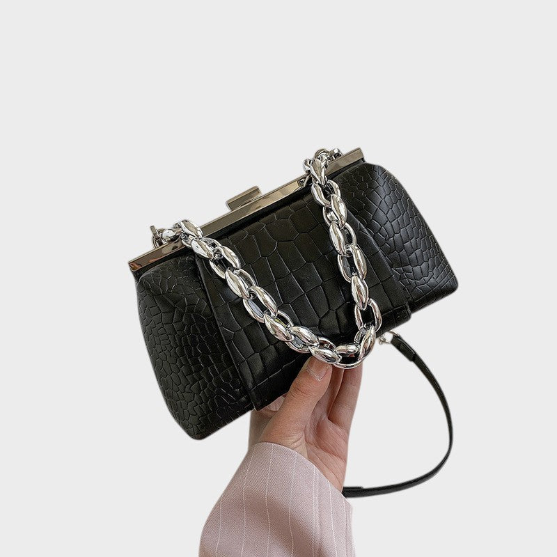 Cu o textură de crocodil și o structură robustă, această geantă îmbină rafinamentul și individualitatea într-un accesoriu. Fermoarul său metalic clasic și mânerele din lanț rezistent creează un contrast modern și impresionant. Este ideală pentru cei care caută un element compact și practic cu o prezență puternică, fie pentru zi, fie pentru noapte.