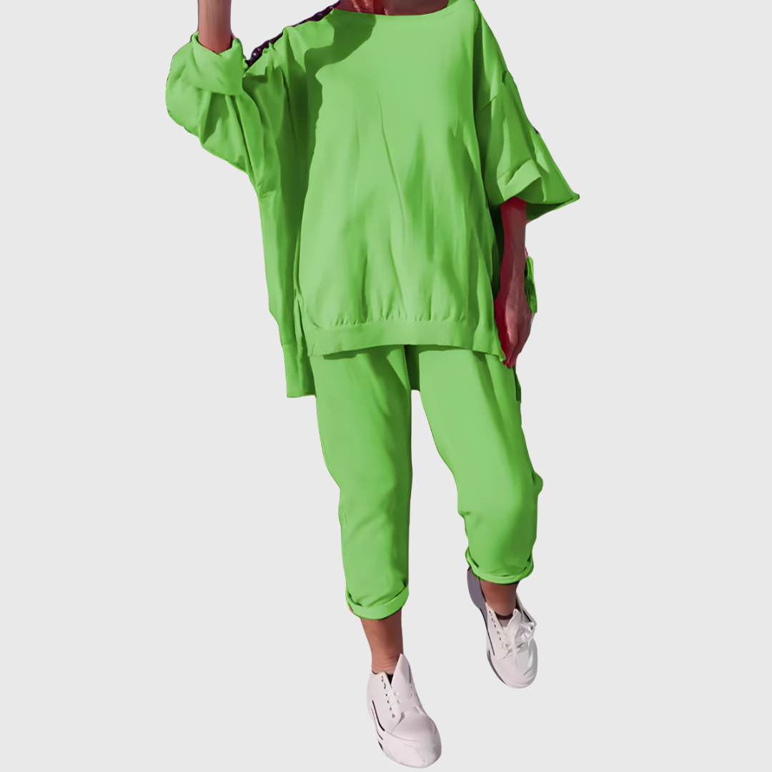 Acest set oferă combinația perfectă între un design lejer și confort practic. Partea de sus cu croi larg și pantalonii cu linii drepte asigură libertate de mișcare, în timp ce aspectul modern te face pregătit atât pentru relaxare acasă, cât și pentru ieșiri informale în oraș. Soluția perfectă pentru cei care doresc să arate modern, dar să se simtă complet relaxați.