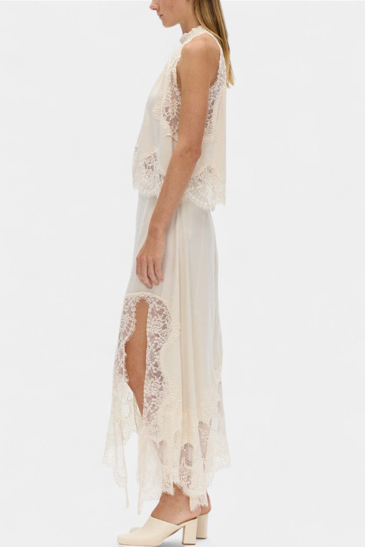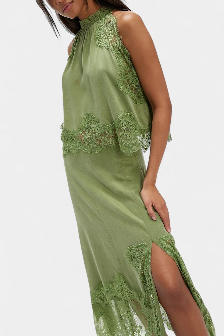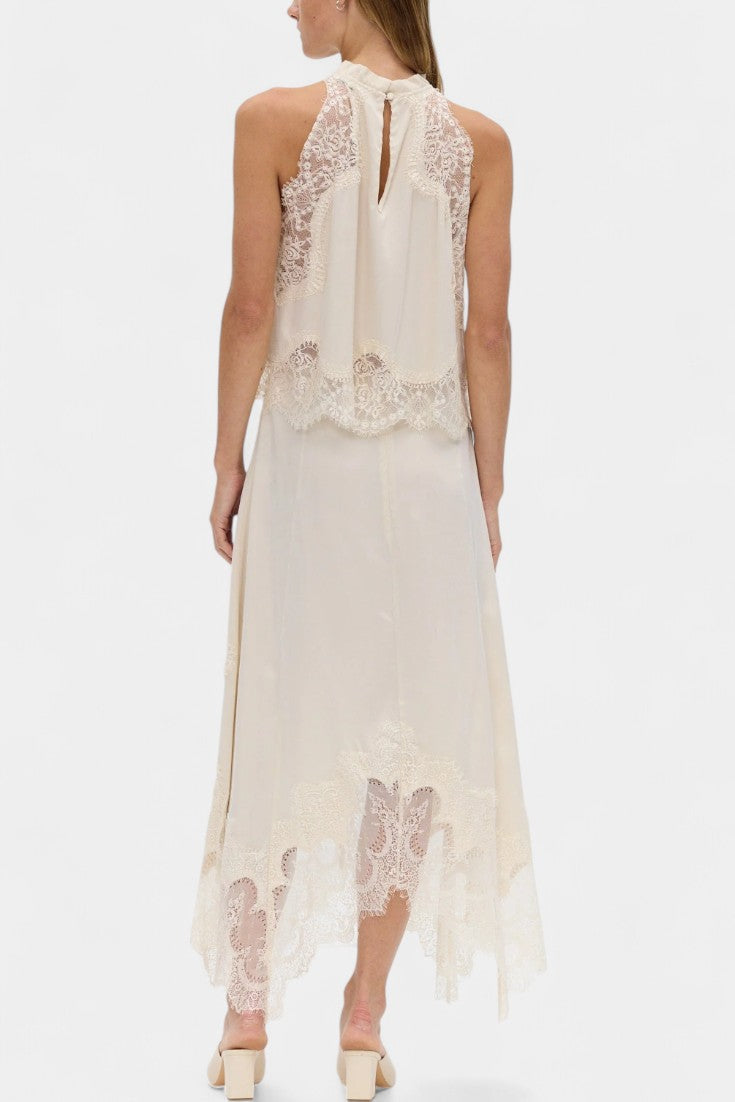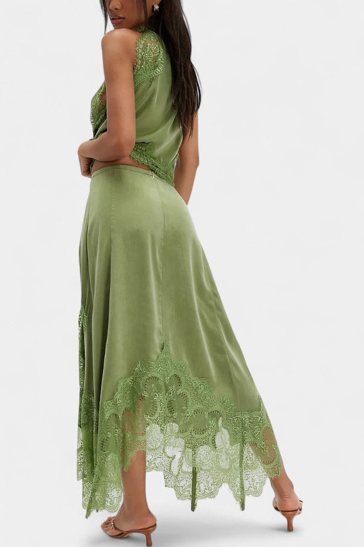 Un set care emană mișcare, prospețime și eleganță atemporală. NADA combină fusta midi cu panouri delicate din dantelă și un tiv asimetric, care conferă fluiditate fiecărui pas, cu un top potrivit care echilibrează eleganța și modernitatea.