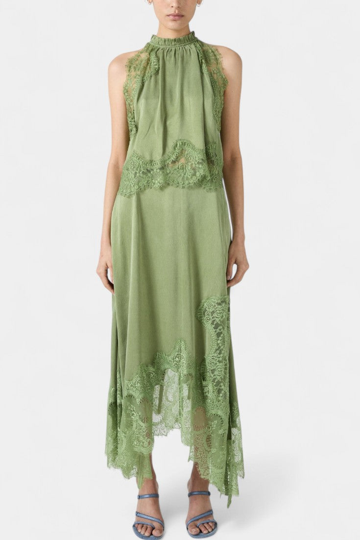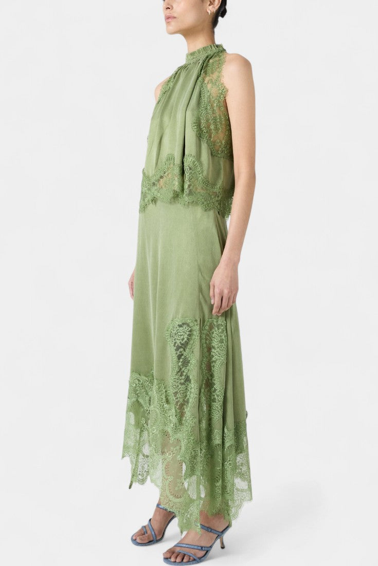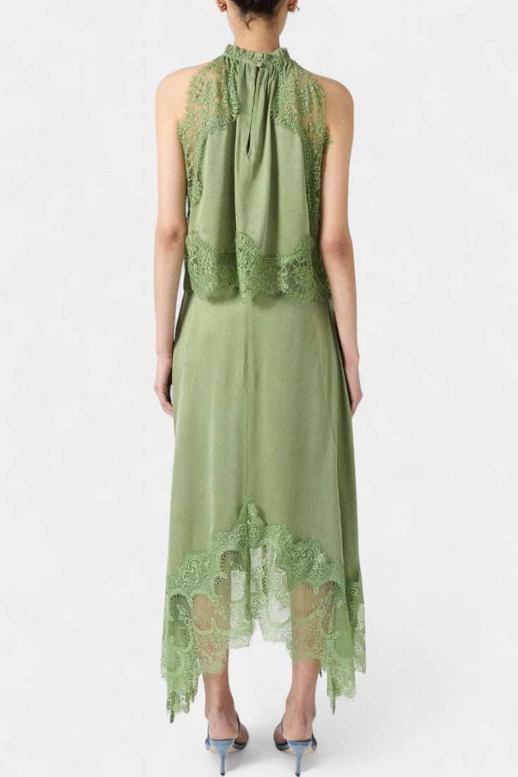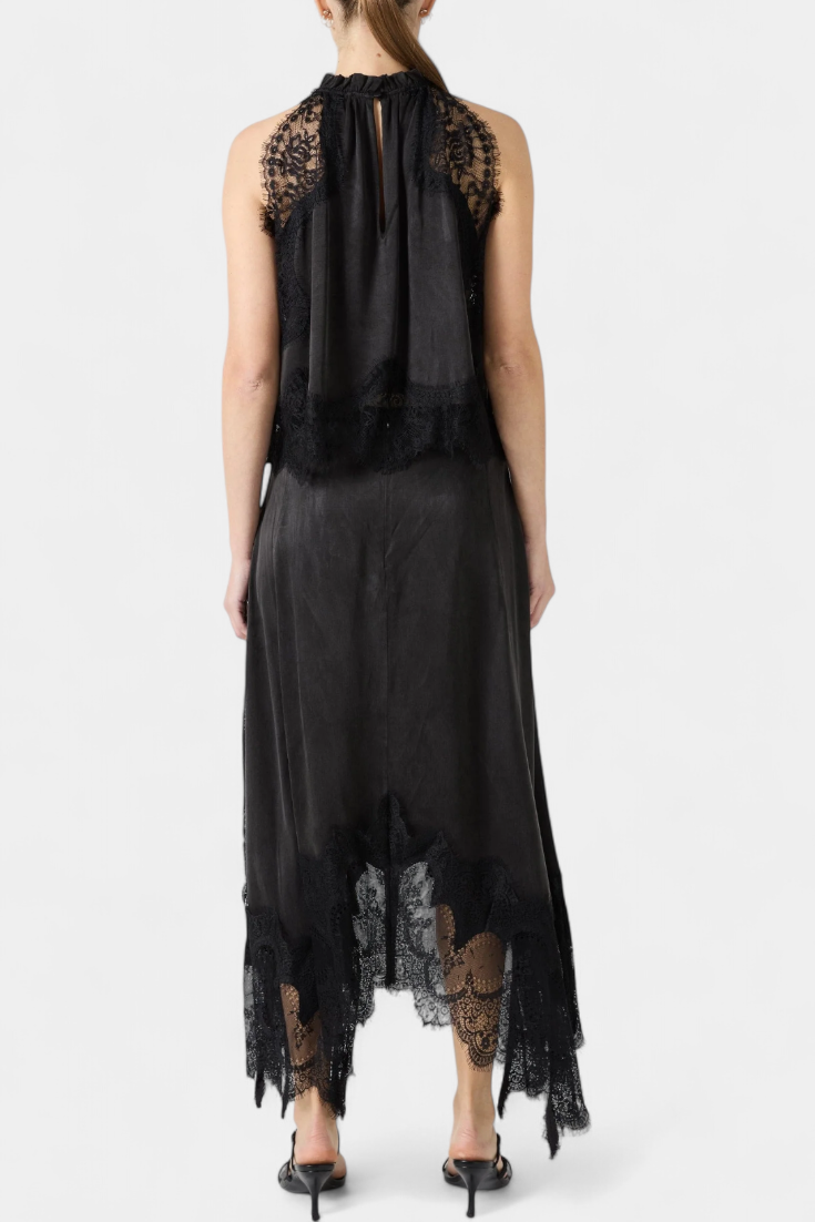 Un set care emană mișcare, prospețime și eleganță atemporală. NADA combină fusta midi cu panouri delicate din dantelă și un tiv asimetric, care conferă fluiditate fiecărui pas, cu un top potrivit care echilibrează eleganța și modernitatea.