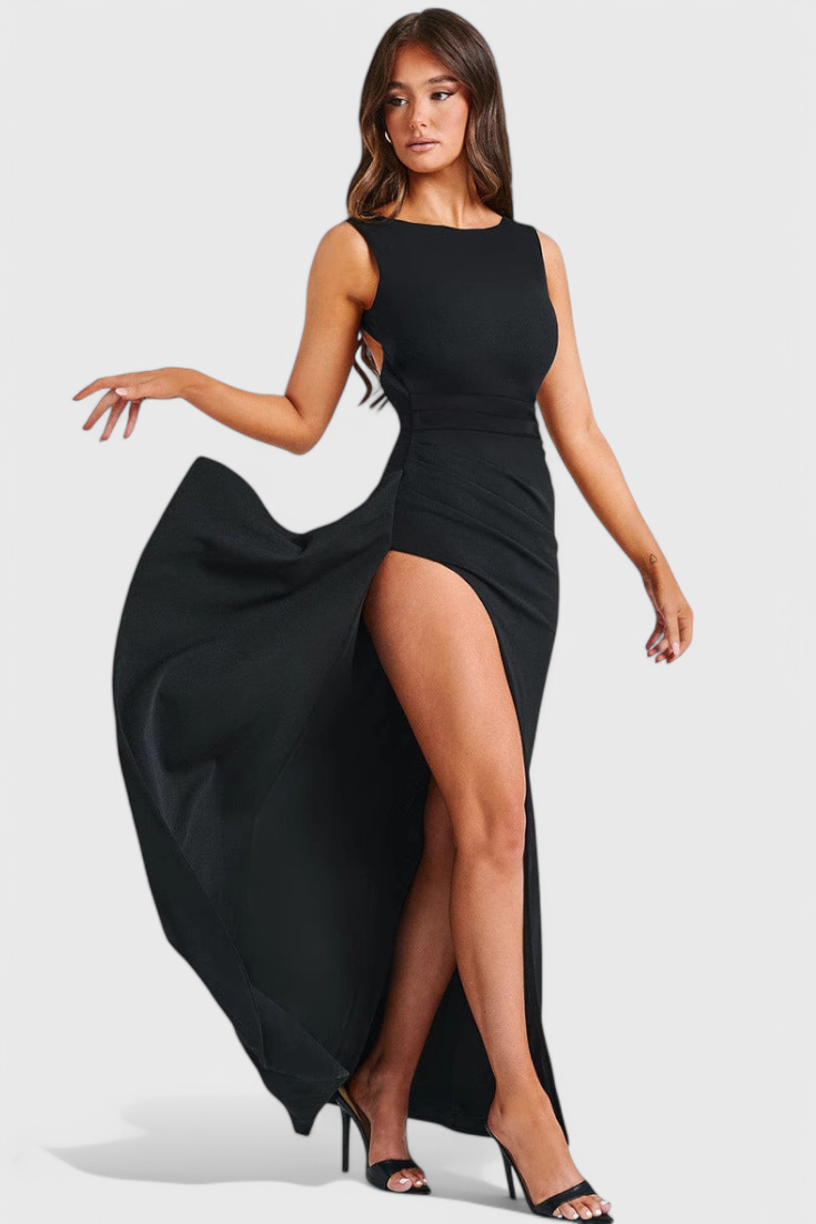 Rochie Ivana din Satin cu Spate Deschis și Fisură Mare