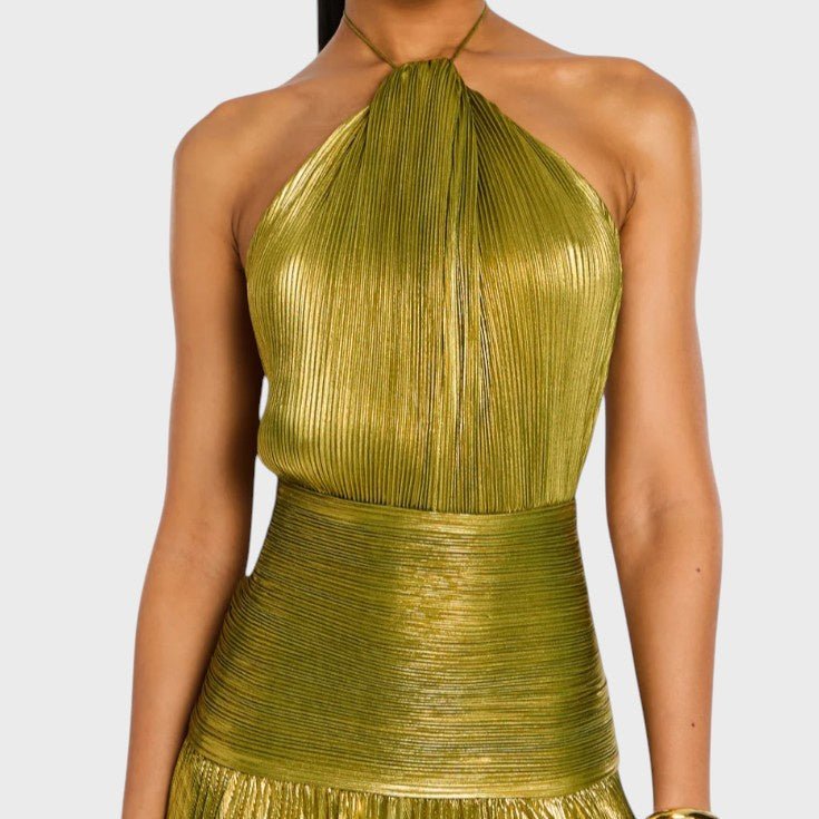 Rochia Vilma încântă cu nuanța metalică de peridot, silueta etereală și detalii rafinate. Cu decolteu halter, spatele descoperit și fanta înaltă, combină curajul și eleganța – ideală pentru cine de gală, seri și nopți de neuitat, pline de mister și feminitate.
