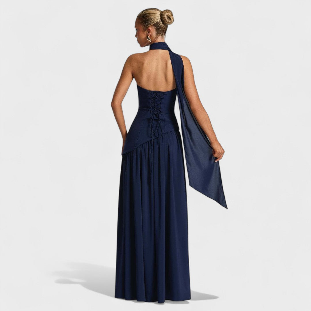 Partea superioară strânsă evidențiază talia și decolteul, creând o linie elegantă și puternică.